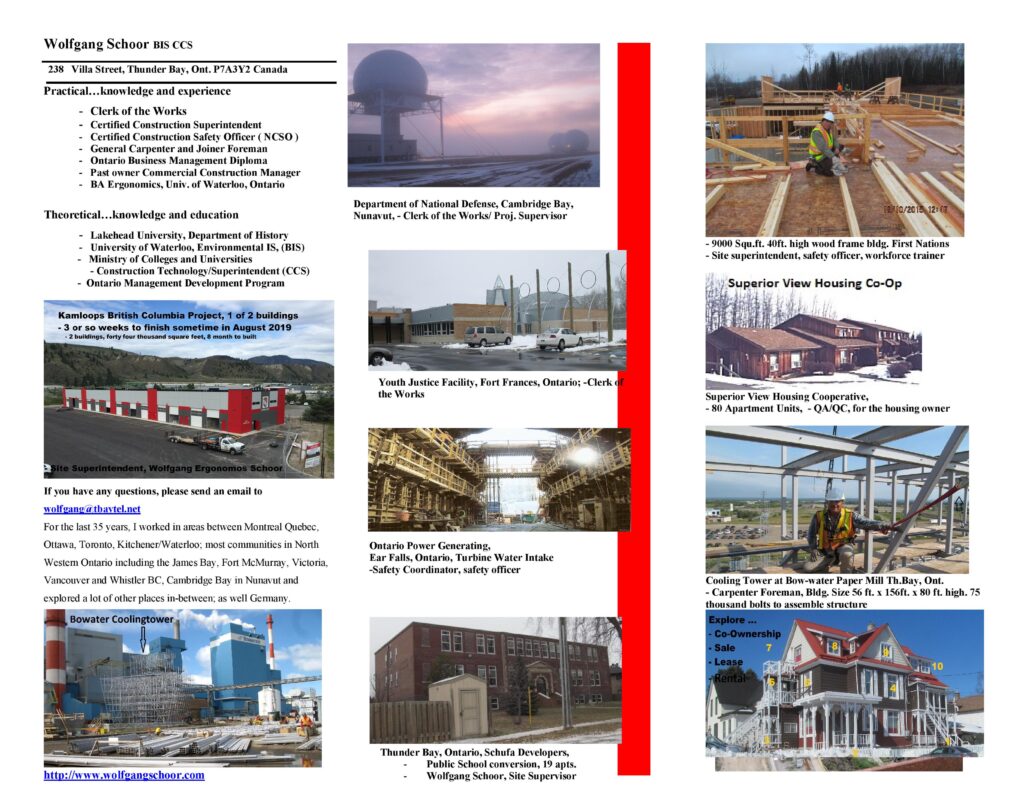 Wolfgang has certifications as carpenter and joiner, certifications as construction superintendent, certification as construction safety officer, master builder and many other certifications required to gain a clear understanding of both, the profession and craft…” Kraft Arbeiter”…translates to workers who extend physical energy to do their work. He also offers knowledge and construction experience in the field of ergonomic tool design, work methodology, construction worker wellness, occupational health and safety, and medium sized project co-ordination or management. Previous projects and dollar values have been ranging from a few thousand dollars to millions of dollars.