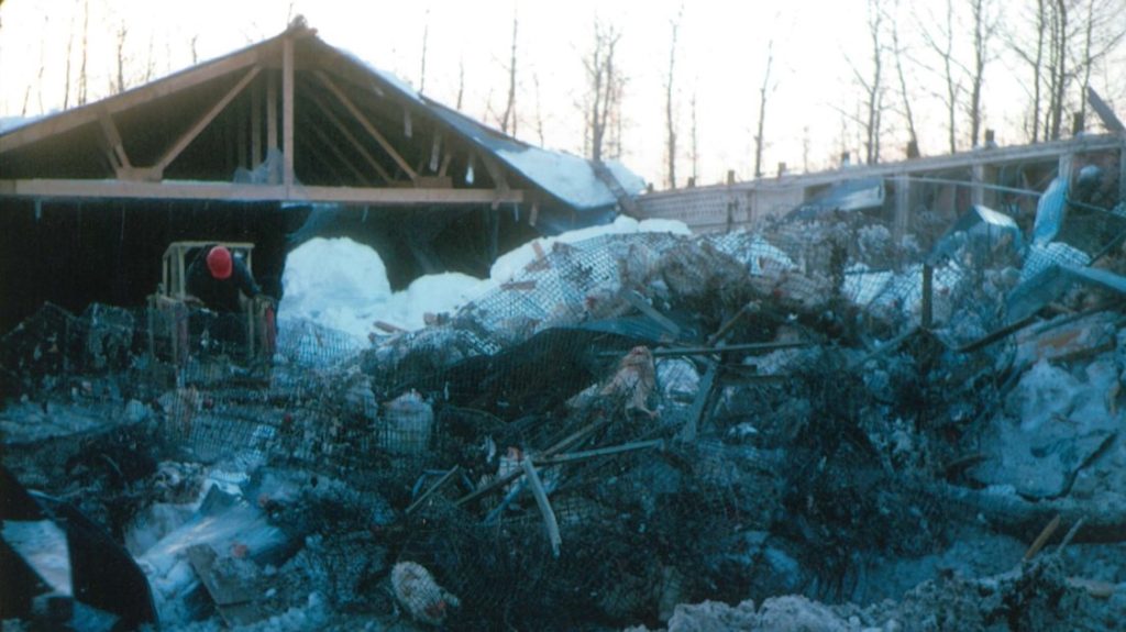 Thunder Bay Fresh Eggs Chicken Farm was comprised of 3 chicken barns, housing 22000 egg-laying chicken hens. The chicken wire and feeding cages were hung from the roof structured trusses. That year, we had an extremely large amount of wet snow accumulation on the roof, which caused it to collapse.